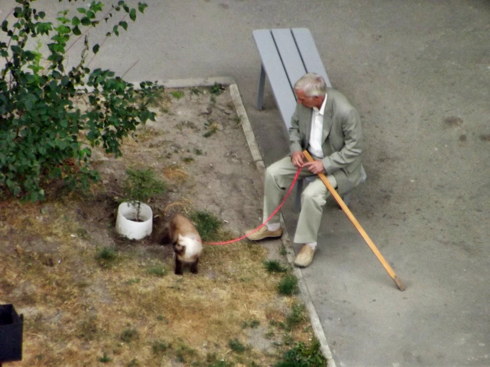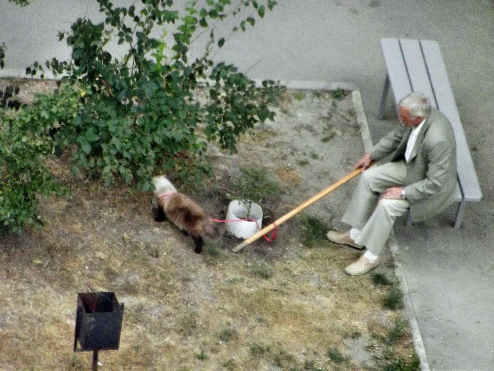 Зачем же дедуле такая большая палка, подумаете вы. И я подумала. Потом поняла. Удлинитель руки в действии. А еще, наверно, ею удобно отгонять бродячих собак, которые водятся в нашем дворе в великом множестве (спасибо строителям, чтоб им хорошо спалось и почаще икалось).